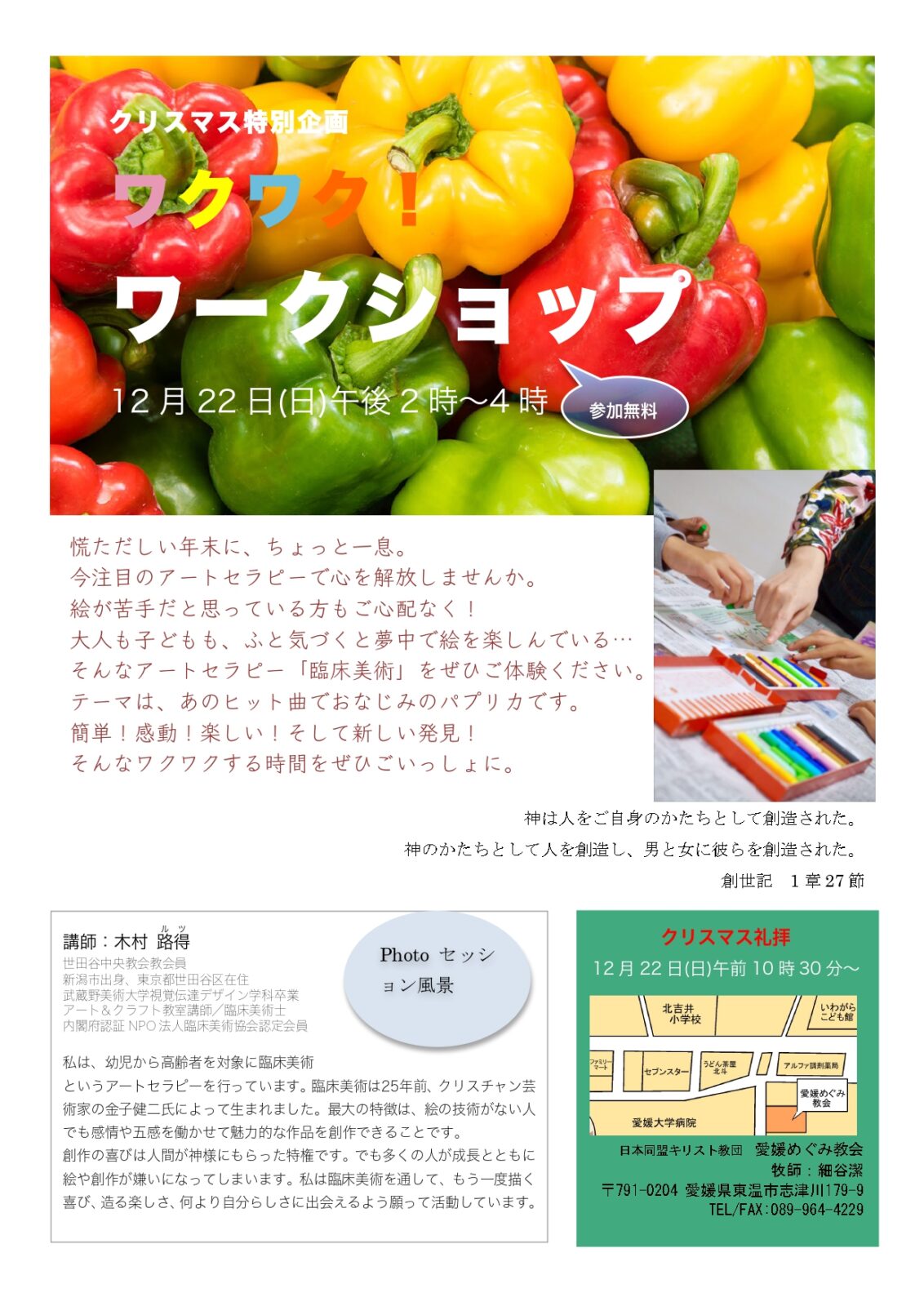 今年のクリスマスにはアートセラピー講師の木村路得(ルツ)氏をお迎えし、ワークショップを開催いたします。 どなたでもご参加いただけます。 お気軽にお越しください。 時間 2019年12月22日14:00~16:00 場所 愛媛めぐみ教会 お知らせ えひめぐキッズクリスマス開催 2020年2月2日特別礼拝のお知らせ。 関連記事 2026.3.29 第二回クリスチャンの生活と証しコース 2026年3月31日 2026.3.22 仲地兄 送別会 2026年3月25日 2026.3.15 第一回クリスチャンの生活と証しコース 2026年3月19日 2026.3.8 FIG 活動報告 2026年3月10日 2026.2.15 青年会 活動報告 2026年2月15日 2026.2.8 FIG 活動報告 2026年2月9日 Migiwa 秋のコンサート in 愛媛めぐみ教会 2025年9月30日 2025.3.2 第3回きいくんCafe開催 2025年2月17日
